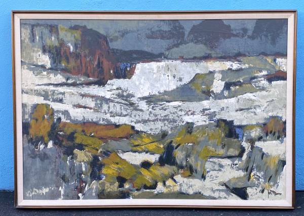 Large mid century Jos Rovers abstract landscape painting. 41.5"x58.5"x2.5". Serigraph on canvas. Small dent in frame otherwise great condition. See other items at: vintagevisions.weebly.com or...