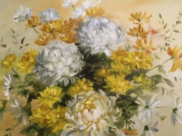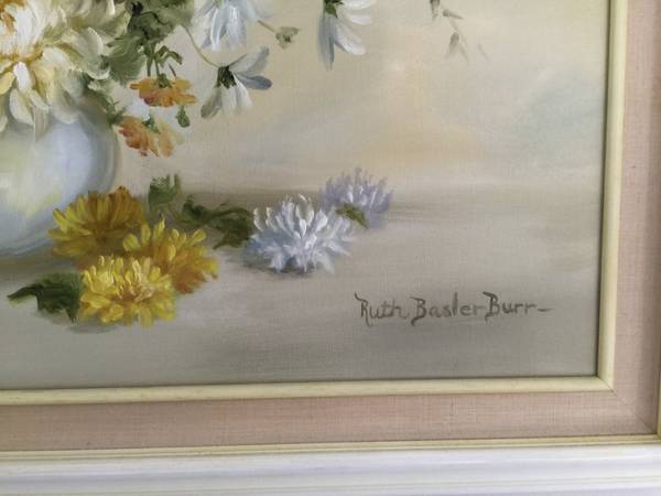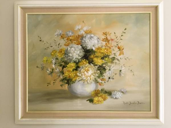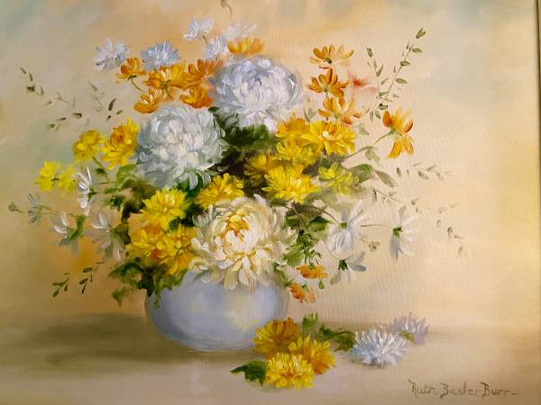 From Grammas Collection of exquisite wall art, we have a professionally framed watercolor painting of Beautiful Chrysanthemum Flowers - Original watercolor painting – by listed California artist Ruth Basler Burr. This gorgeous still life with flowers will add an air of peaceful beauty and serenity in your home or office space. It needs to be seen and experienced.