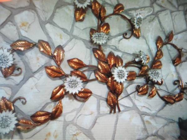 Hollywood Regency Italian gold metallic wall art with white flower lights.