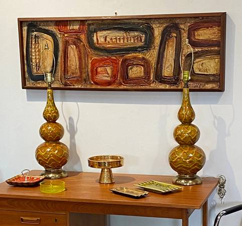 Vintage R Russell abstract impasto painting. 16.75"x49"x2.5"d. Painting is in good condition. Frame has some nicks. Hanging wire on back. Signed and dated 1974. A real statement piece!