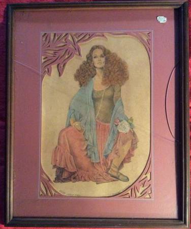 This print is from the 1970's. It looks amazing. It's a woman with curly long hair sitting down. The intricate matting looks great. The glass is broken in two spots. It needs new glass or to be reframed.