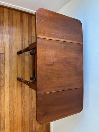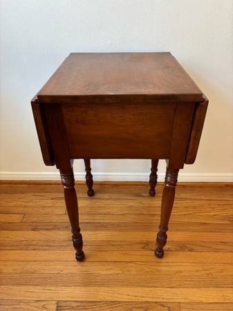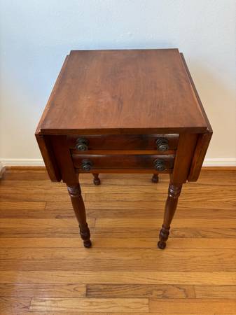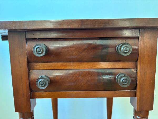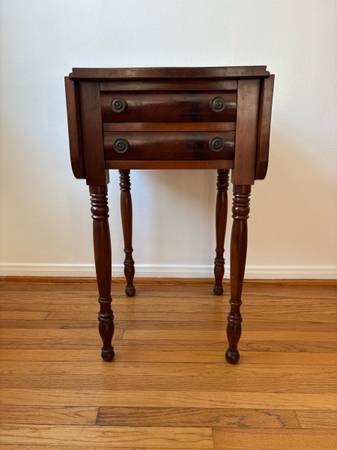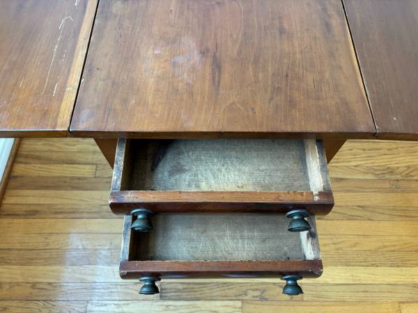 This is an antique mahogany drop-leaf side table with two drawers and turned legs. Great condition for its age. Well intact. Some antique wear (all pictured).