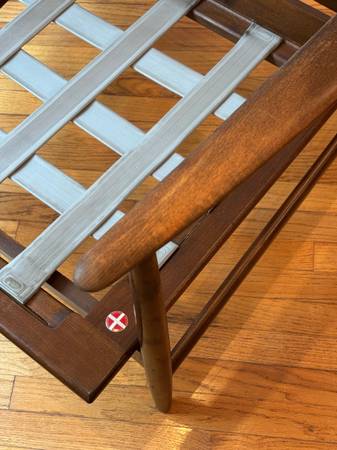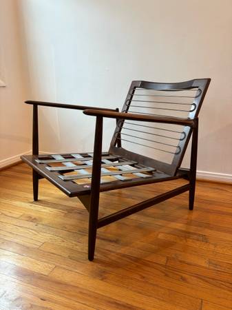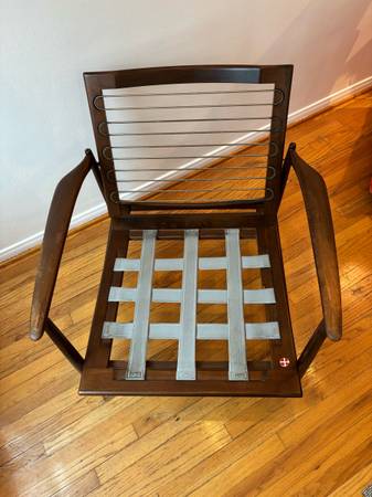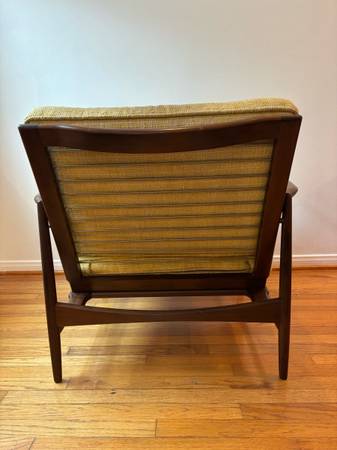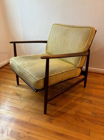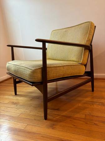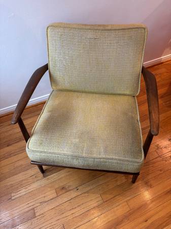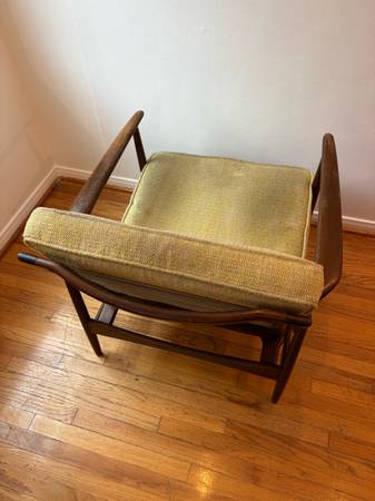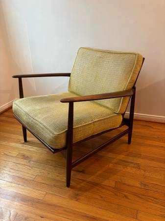 This is a mid-century modern Danish teak lounge chair designed by Ib Kofod-Larsen for Selig, featuring a teak frame and light green or yellow textured fabric upholstery.