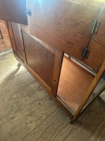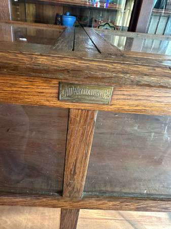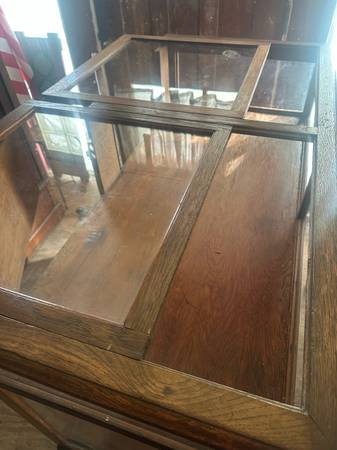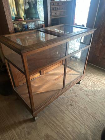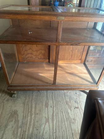 Turn of the century oak showcase, has cast iron claw feet on 4 corners and the original wavy glass