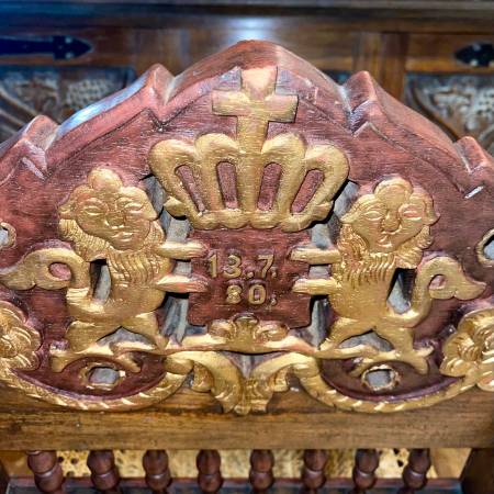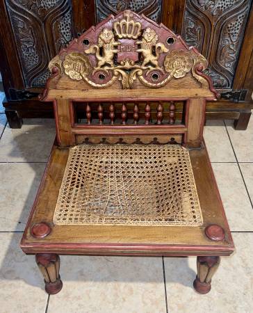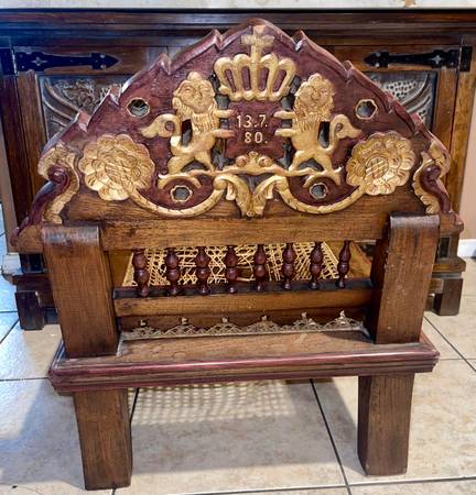 Antique Carved Wood Decorative Indian / Islamic Short Chair. Has a tear in the lining but can be repaired or covered. Total height: 24” Seat length: 20” Seat width: 19” Seat height: 10”