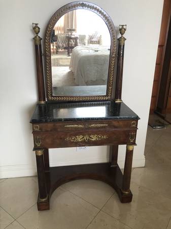 Gorgeous Antique Empire Vanity made of walnut with marble dark green and black top. It has a domed adorned mirror, a lock on front drawer, as well two separate side drawers. It measures 57 1/2" tall (from floor to top of mirror), 30"wide, 17 1/4" deep, and 40" from floor to marble table top. $1,500 or best offer