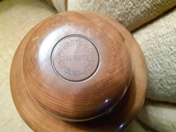 Antique medicine bottle with rough pontil mark in a boxwood carrying case. The lid of the case has the following inscription: "Roberts &; Co. Chemists London &; Paris", the bottom of the case has "16oz" stamped. This company was established in business in 1823 (https://digitalsc.lib.vt.edu/Ms1989-021/Ms1989_021_NelsonFamily_LondonChemistNotice). Cash only