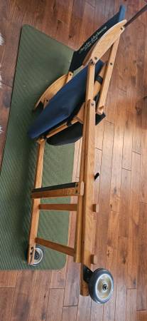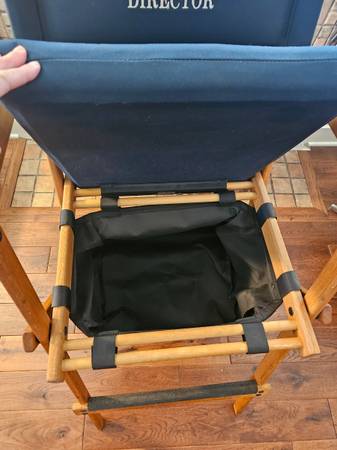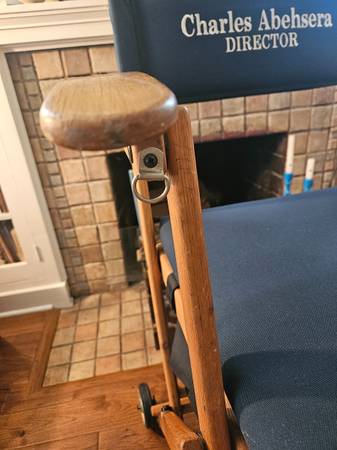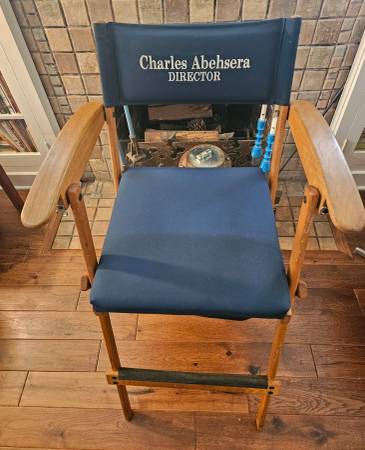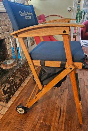Custom embroidered for Director, Charles Abehsera. This has been in storage and is very clean. It folds down and is transportable but heavy as its made in solid oak.