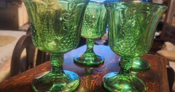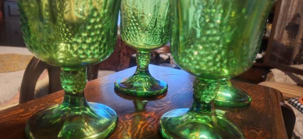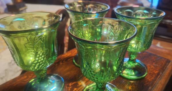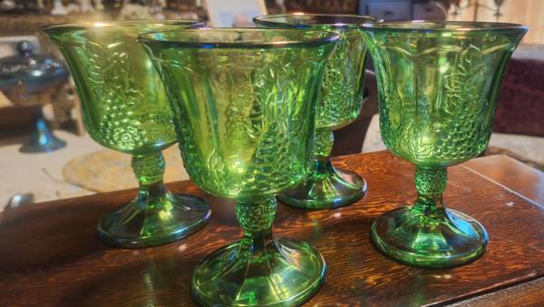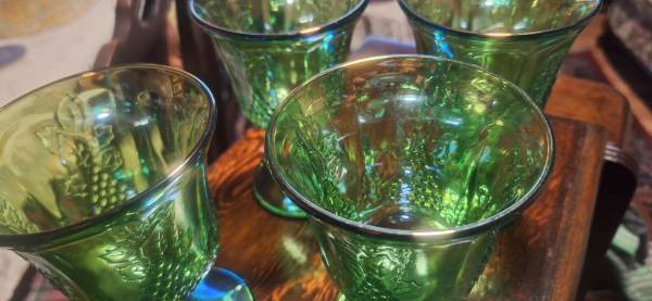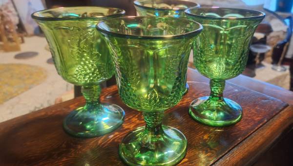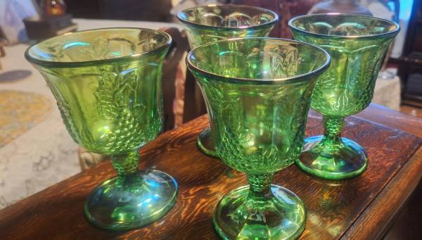 Vintage Indiana glass lime Iridescent Carnival Glass. Set 4 goblets, harvest Grape. Tall 5.25" , 3.25 top opening across. No chips or cracks whatsoever good condition.