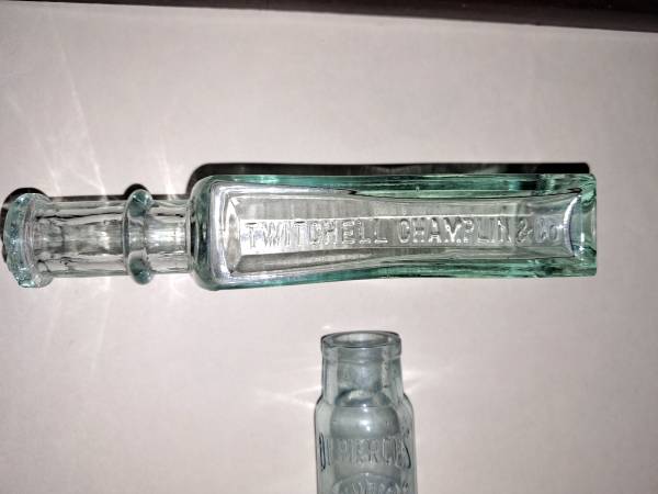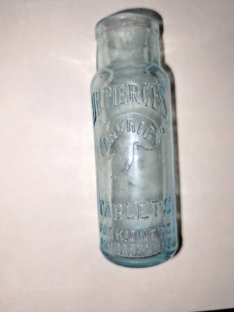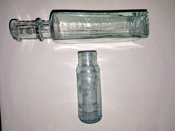 Two antique quack medicine bottles: 1. "Dr. Pierce's Anuric Tablets for Kidneys and Backache" in embossed lettering with an embossed kidney. Bottle is 3.5 inches high. These types of preparations often contained opium and/or alcohol and quinine. Blown glass in mold with small bubbles. 2. Neuralgic Anodyne by Twitchell Champlin & Co. (located in Portland Maine). According to my research, this would have contained 75% alcohol and 8/10 grain of opium in each ounce. Used for headaches, neuralgia, etc.. Blown glass, small imperfection or chip in lip. 6 1/8 inch high. Cash only