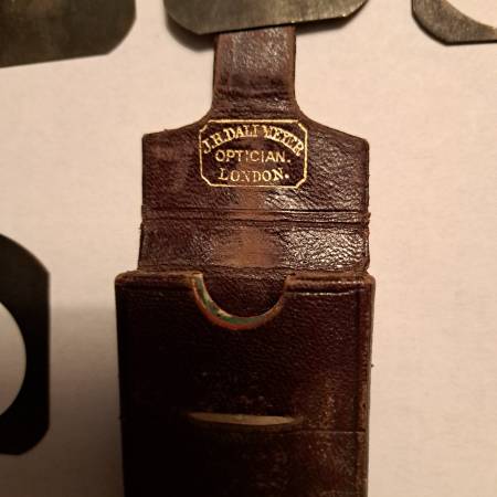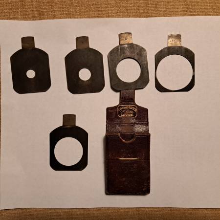 Set of 6 Waterhouse stops by the optician J.H. Dalimeyer of London. Waterhouse stops, invented in the late 1850s by Waterhouse, were used in antique cameras that were in the brass barrel era of camera lenses with varying apertures. One has the serial number 36133, the other 4 have numbers stamped, 2, 4, 5 and what appears to be an "x". In original case with the J.H. Dalimeyer Optician London on the inner flap. Cash only and local pick-up in Los Angeles.