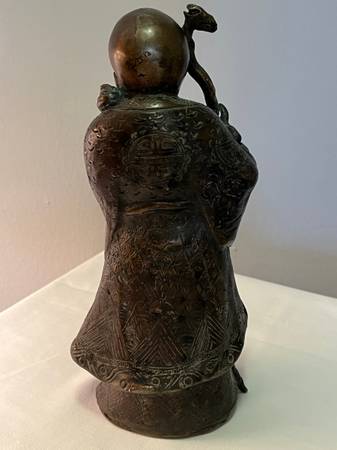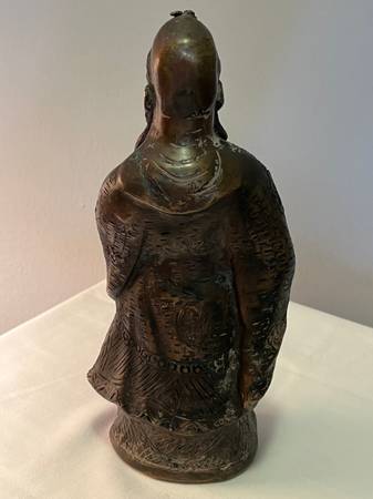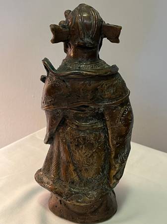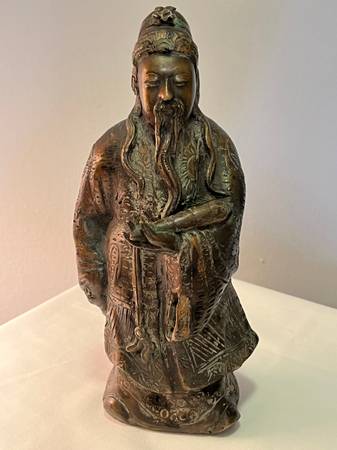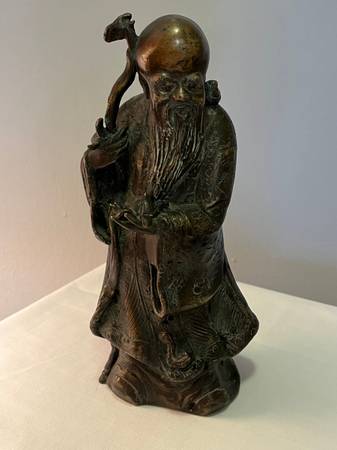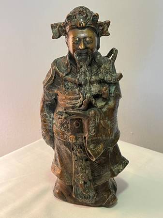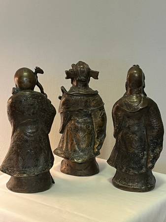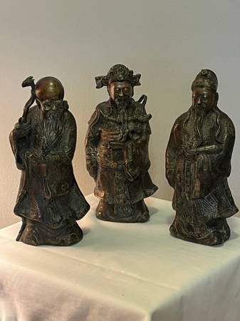 THIS BEAUTIFUL SET OF VINTAGE CHINESE DEITY FIGURINES REPRESENTING FU HSING, THE GOD OF GOOD FORTUNE, LU HSING, THE GOD OF PROSPERITY AND SHOU HSING, THE GOD OF LONGEVITY. EACH HAS BEEN CRAFTED FROM HEAVY SOLID BRONZE AND MEASURES 9 1/2" TALL AND 4" WIDE. EACH FIGURE IS RICHLY DETAILED AND SYMBOLIZES THE BLESSINGS VALUED IN CHINESE CULTURE.