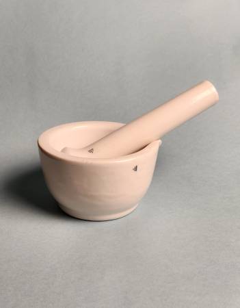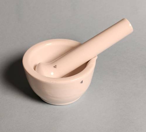 Vintage Mortar and Pestle made by Coors U.S.A. Yes, this is the same Coors that makes Beer and they've been around for over a hundred years. Excellent Condition with no chips, cracks, or stains. Very, very clean. Made of Ceramic Porcelain. Heavy Duty. Used by Pharmacist to compound drugs. Excellent for home or commercial kitchens for grinding herbs and spices for gourmet meals. This is made of Pharmaceutical, Medical Grade Materials which make it easily Food Grade Materials. The Mortar (Bowl) is 3 1/8" High x 5 1/4" in Diameter. The Pestle (Grinder) is 7 5/8" Long with a tapered handle. The head diameter is approximately 2 1/4". Both pieces are marked in blue with Coors U.S.A. and with a number 3. These collectable pieces are sought after by scientist, chefs, pharmacists, doctors and anyone looking for the best high-quality motor and pestle you can find. Only $95 or best offer. Call Ken at show contact info