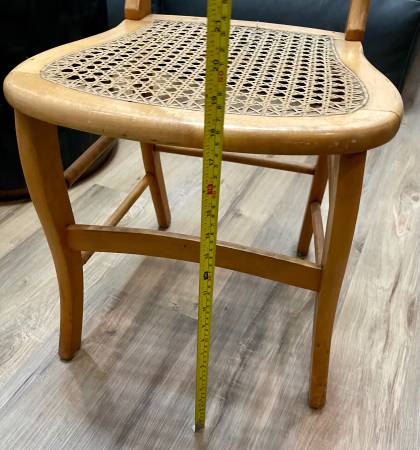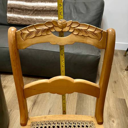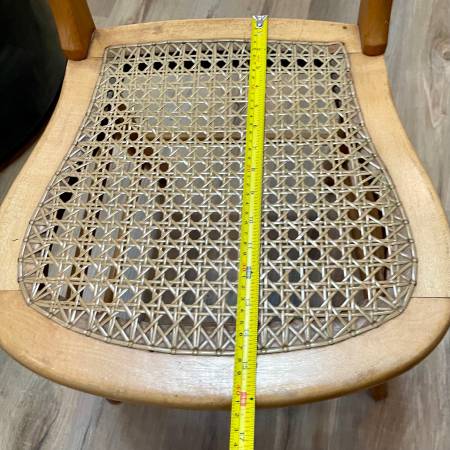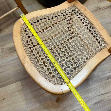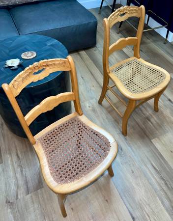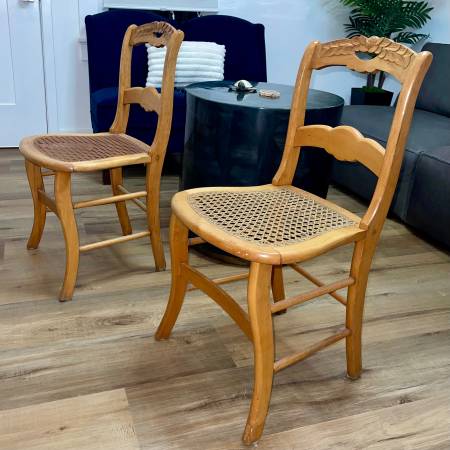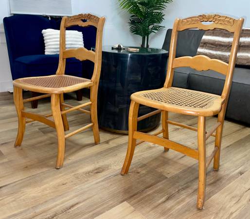Add timeless charm to your space with this vintage set of ladderback chairs featuring handwoven cane seats. Each chair showcases classic turned wood detailing, a warm patina, and sturdy craftsmanship that speaks to its age and quality. The woven cane seats are beautifully intact, offering both comfort and style. Perfect for a farmhouse dining room, rustic kitchen, or as accent seating in a cozy nook.