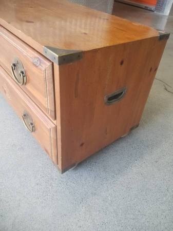 Vintage Henredon footed campaign dresser with 2 drawers, carved Asian motif medallions, 2 drawer fronts with brass campaign hardware corners and metal pulls. Round wood bun feet, patina wood and hardware.