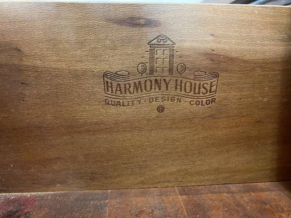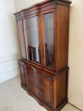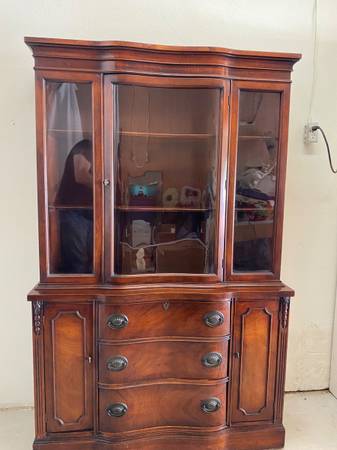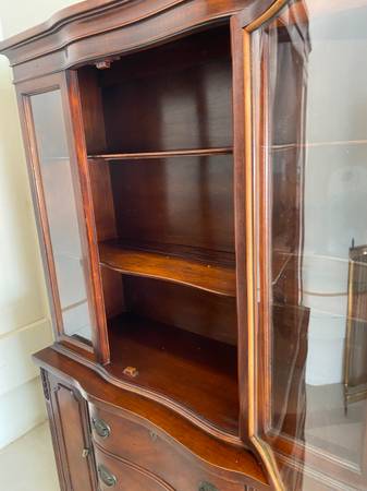 Mahogany serpentine front china cabinet with two glass shelves over three dovetailed constructed drawers with a door to each side. Marked Harmony House to the top drawer. In overall good condition consistent with age and use. Measures approximately 69-5/8" high, 40-1/2" wide, and 17" deep.