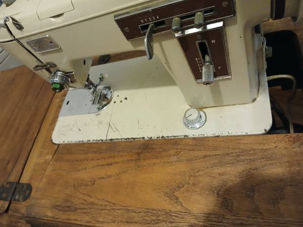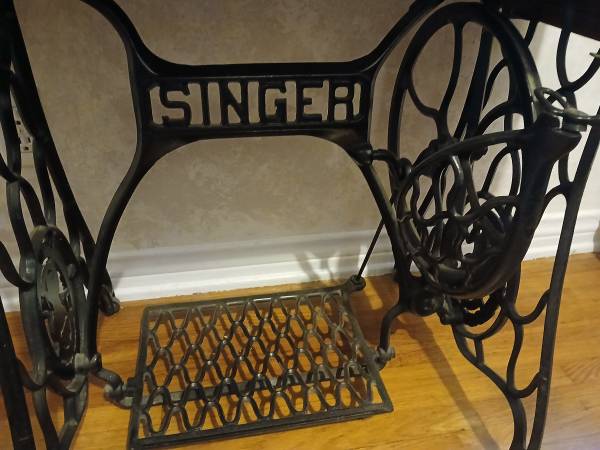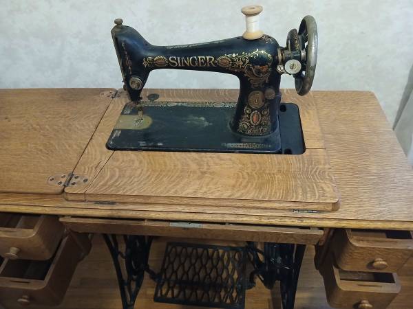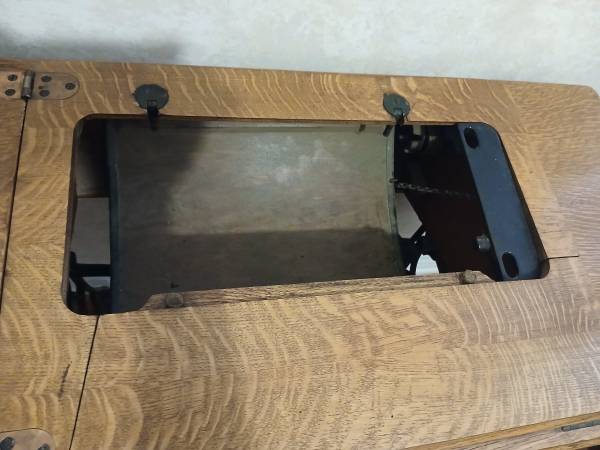 Oak cabinet with nice finish and cast iron base in great condition, no repairs needed. Double storage drawers on each side plus center flip down compartment. Singer #66 machine could use some TLC/oil, not functional as is, or a newer machine could be easily mounted in its place then folded up out of sight when not in use. The cabinet can also be easily unscrewed and replaced with a solid wood top for a unique side table. Bobbins included.