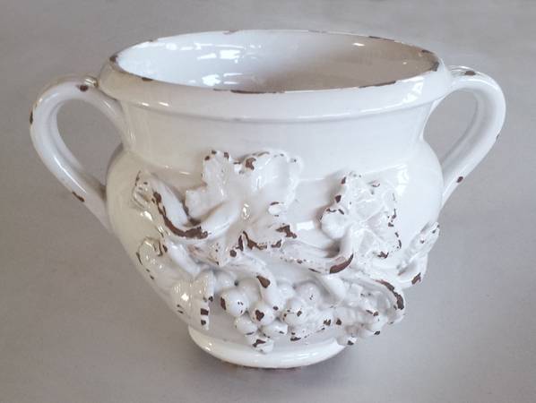 Victorian Era (1850–1900): Most likely, given the shape and relief decoration. The floral relief decoration was especially popular in the late 19th century — many English and European potteries produced similar ornate patterns. The double handles and rounded body are also consistent with Victorian and Edwardian chamber pots (mid-1800s to early 1900s).