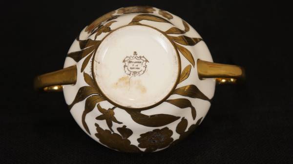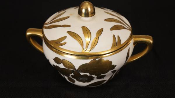 Porcelain China sugar bowl with hand-painted gold orchids and leaves, signed.