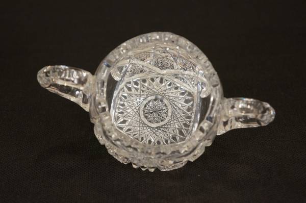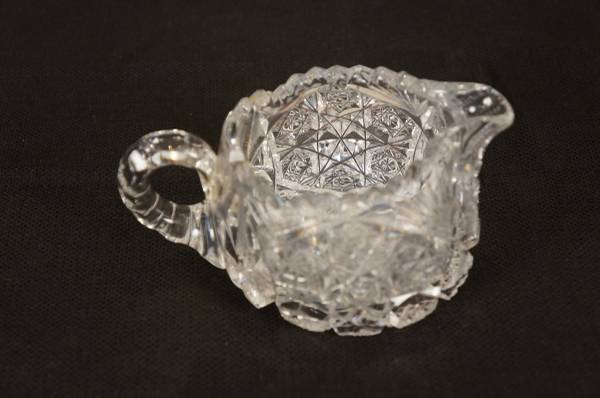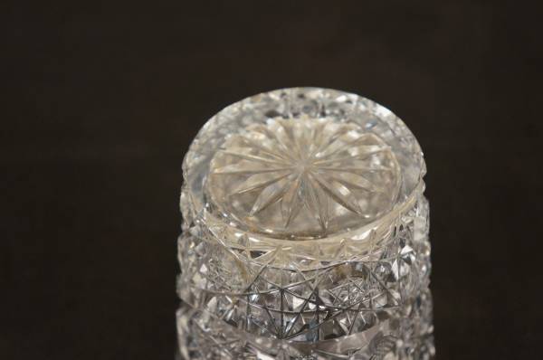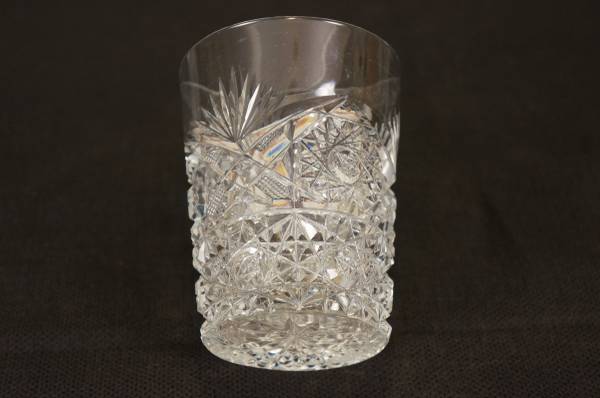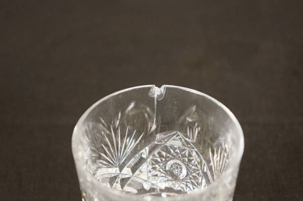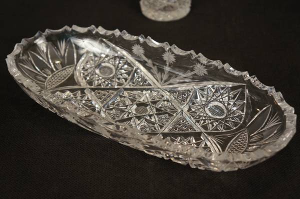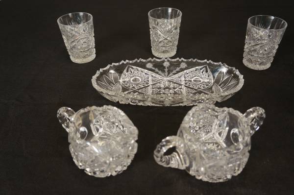 Beautiful crystal glasses (2 + 1 chipped) with intricate patterns, and matching serving glassware