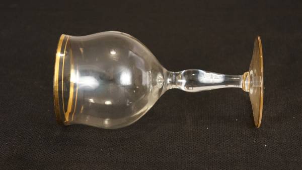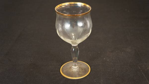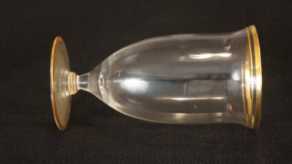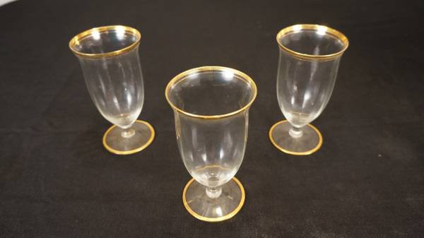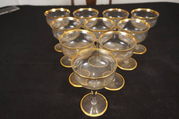 Here's a few sets of matching antique champagne (10), wine (12), water (14) glasses with gold rims,