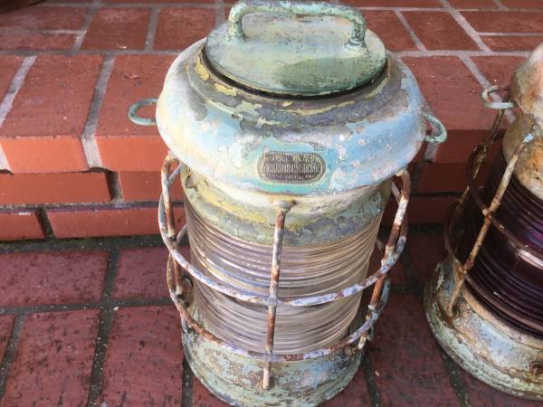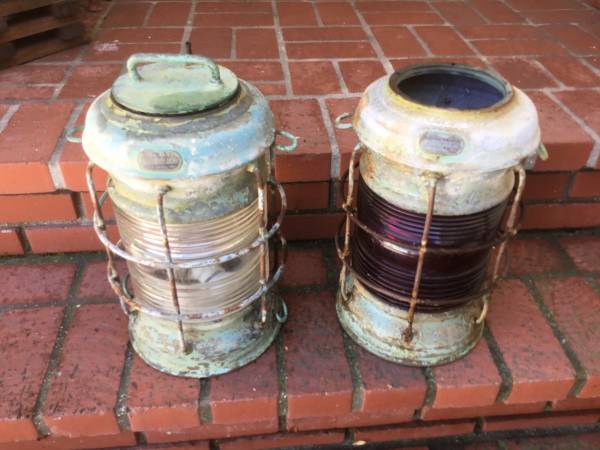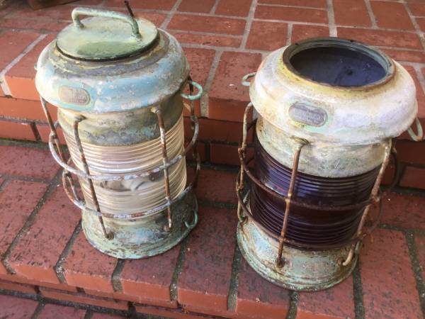 Vintage Marine Lamps. A. Ward Hendrickson. 2 pieces. I think this are 1940s / 50s. Possibly older. 2 pieces in very good cond. one red glass, one clear. Thick ribbed glass. No breaks. Clear one has a 3/4’ chipped but not through glass. One is missing top cap. Pretty easy to have another fabricated. These are part brass, part galvanized. These came out of an old upper Malibu Beach Bluff estate. $350.00 price is firm. Leave a phone if interested.
