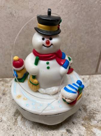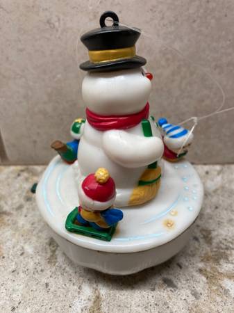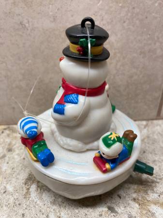 A snowman watches over 3 youngsters as they sled around him in the snow! Just hang this from your tree, plug into a light, and let the fun begin. The snowman's nose lights up too! There are 2...
