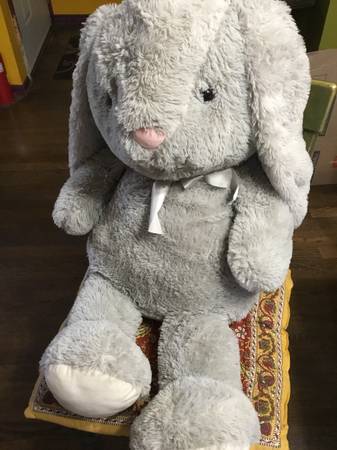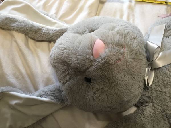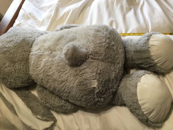 He is about 3 feet when stretched out. He can sit up. He is huggable and soft. He is gray with a big, pink nose.