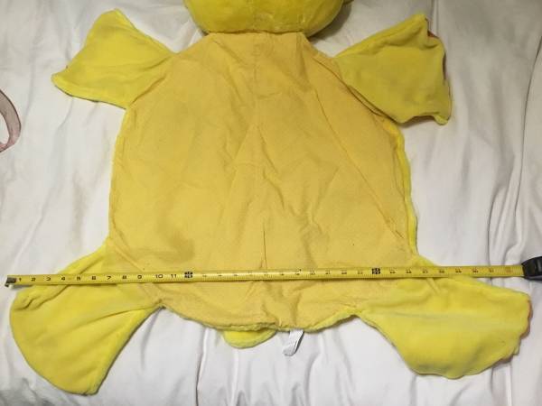 His head is a plush. His body is flat. His front is polyester and rayon. His bottom has textured dots. From paw to paw he is about 34”. He has never been used.