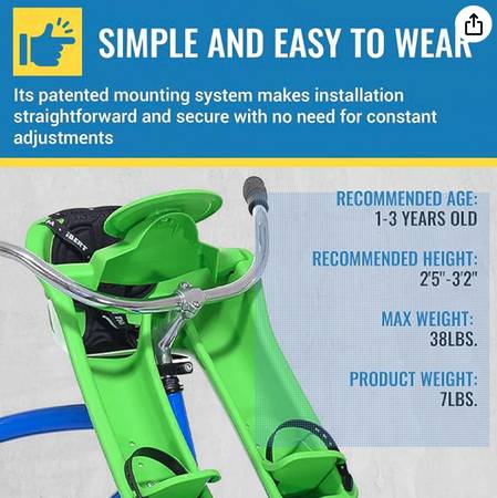 Front-mounted child bike seat in good condition. My daughter outgrew it but it served us well for weekend rides around the neighborhood. All straps and harness work perfectly, plastic shows normal wear. Easy to install on most bikes.