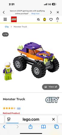 LEGO City Monster Truck, #60251, retired, 55 pieces, ages 5 and older. From the year 2020. 100% complete, double checked the inventory of pieces. Pre-owned open box with has instructions.
