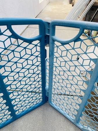 7 interlocking plastic gates for babies/toddlers or pets. Lightweight, super-easy to link together and take apart. We used it to keep our baby/toddler from leaving a play area and also to keep pets out of an area. 7 pieces at about 3' each makes a fence of approximately 21 feet. Easy to set up, tear down, and store when not in use. $40 for the entire set obo.