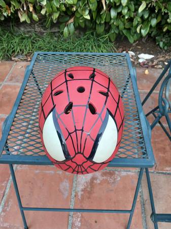 Spider-Man themed kids bicycle with training wheels. Air-filled tires. Comes with matching helmet. Paint is a bit faded but otherwise in very good condition. Beginner bike for kids ages 2-4