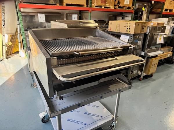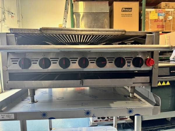 THIS IS A MagiKitch'n APM-RMB-636 36" Natural Gas Low Profile Stainless Steel Radiant Charbroiler - 105,000 BTU. NEW THEY ARE OVER $8900 AT $1750 IT IS A GREAT BUY. We are located at GENE SHOOK RESTAURANT EQUIPMENT at 12583 Crenshaw Blvd , in Hawthorne CA , 90250. Call us for all your restaurant equipment needs. We readily stock both new and used and always great prices! We specialize in refrigerators, freezers, fryers, griddles, stoves, prep tables, stainless steel tables, safes, char grills, keg orators, bar back, sinks, ice machines, and much more! CALL US AT 310_292_1182 Always call us for the best deal