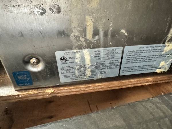 THIS IS A Moffat G32D5-1-N BUILT 6-22-2023 ONLY 2 YEARS OLD, Turbofan Single Deck Full Size Natural Gas Digital Convection Oven with Steam Injection - 110-120V, 1 Phase, 33,000 BTU. THEY GO FOR OVER $5,700 NEW AT $2200. SERIAL 2315672We are located at GENE SHOOK RESTAURANT EQUIPMENT at 12583 Crenshaw Blvd , in Hawthorne CA , 90250. Call us for all your restaurant equipment needs. We readily stock both new and used and always great prices! We specialize in refrigerators, freezers, fryers, griddles, stoves, prep tables, stainless steel tables, safes, char grills, keg orators, bar back, sinks, ice machines, and much more! CALL US AT 310_292_1182 Always call us for the best deal