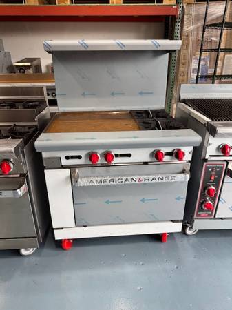 THIS IS AN American Range AR-24G-2B 36" Gas Restaurant Range w/ (2) Open Burners, (1) 24" THERMOSTATIC Griddle, (1) Standard Oven, 139.000 BTU NATURAL GAS. THEY GO FOR OVER $5550 NEW AT $1950 IT IS A GREAT BUY. UNIT WAS IN STORAGE SO WARRANTY MAY NOT APPLY. We are located at GENE SHOOK RESTAURANT EQUIPMENT at 12583 Crenshaw Blvd , in Hawthorne CA , 90250. Call us for all your restaurant equipment needs. We readily stock both new and used and always great prices! We specialize in refrigerators, freezers, fryers, griddles, stoves, prep tables, stainless steel tables, safes, char grills, keg orators, bar back, sinks, ice machines, and much more! CALL US AT 310_292_1182 Always call us for the best deal