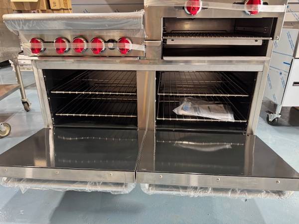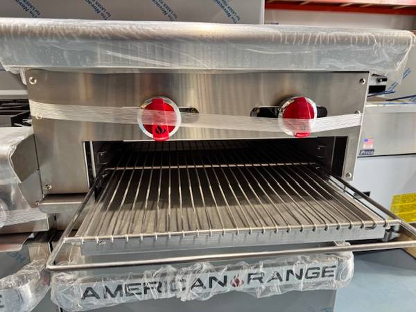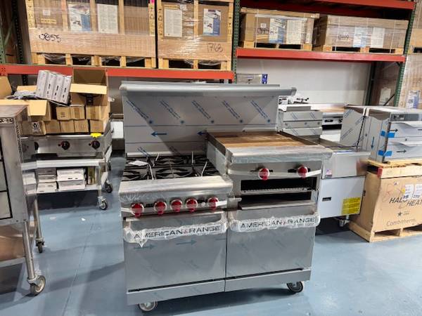 THIS IS AN American Range, AR-4B-24RG_NAT, Restaurant Range, gas, 48", (4) 32,000 BTU open burners, (1) 24" raised griddle/broiler on right, 3/4" thick plate, manual controls, (2) 20" space saver ovens, (2) racks each oven, stainless steel front, sides, 222,000 BTU NATURAL GAS. THEY GO FOR OVER $8500 NEW AT $2950 IT IS A GREAT BUY. UNIT WAS IN STORAGE SO WARRANTY MAY NOT APPLY. We are located at GENE SHOOK RESTAURANT EQUIPMENT at 12583 Crenshaw Blvd , in Hawthorne CA , 90250. Call us for all your restaurant equipment needs. We readily stock both new and used and always great prices! We specialize in refrigerators, freezers, fryers, griddles, stoves, prep tables, stainless steel tables, safes, char grills, keg orators, bar back, sinks, ice machines, and much more! CALL US AT 310_292_1182 Always call us for the best deal