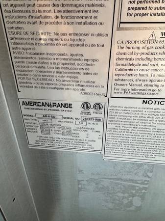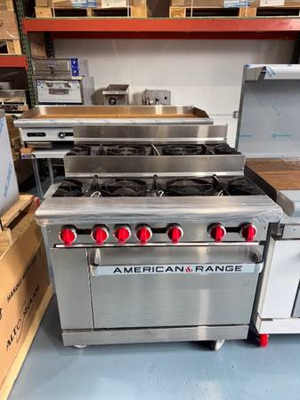 THIS IS AN American Range AR-6-SU 36" Gas Restaurant Range w/ (6) Open Burners, (1) Wide Standard Oven, 227.000 BTU NATURAL GAS. THEY GO FOR OVER $5225 NEW AT $1950 IT IS A GREAT BUY. UNIT WAS IN STORAGE SO WARRANTY MAY NOT APPLY. We are located at GENE SHOOK RESTAURANT EQUIPMENT at 12583 Crenshaw Blvd , in Hawthorne CA , 90250. Call us for all your restaurant equipment needs. We readily stock both new and used and always great prices! We specialize in refrigerators, freezers, fryers, griddles, stoves, prep tables, stainless steel tables, safes, char grills, keg orators, bar back, sinks, ice machines, and much more! CALL US AT 310_292_1182 Always call us for the best deal