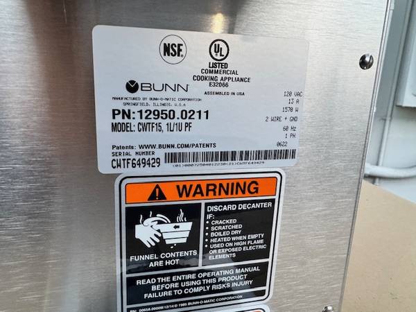 THIS IS A NEW Bunn CWTF15-2 Medium Volume Decanter Coffee Maker - Automatic, 3 4/5 gal/hr, 120v (12950.0211). THEY GO FOR OVER $900 NEW AT $350 IT IS A GREAT BUY. I HAVE 2 UNITS PRICE IS EACH. We are located at GENE SHOOK RESTAURANT EQUIPMENT at 12583 Crenshaw Blvd , in Hawthorne CA , 90250. Call us for all your restaurant equipment needs. We readily stock both new and used and always great prices! We specialize in refrigerators, freezers, fryers, griddles, stoves, prep tables, stainless steel tables, safes, char grills, keg orators, bar back, sinks, ice machines, and much more! CALL US AT 310_292_1182 Always call us for the best deal