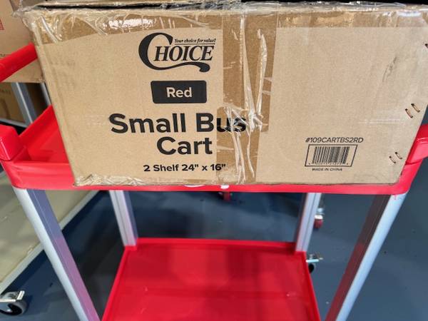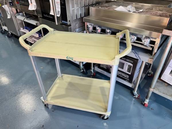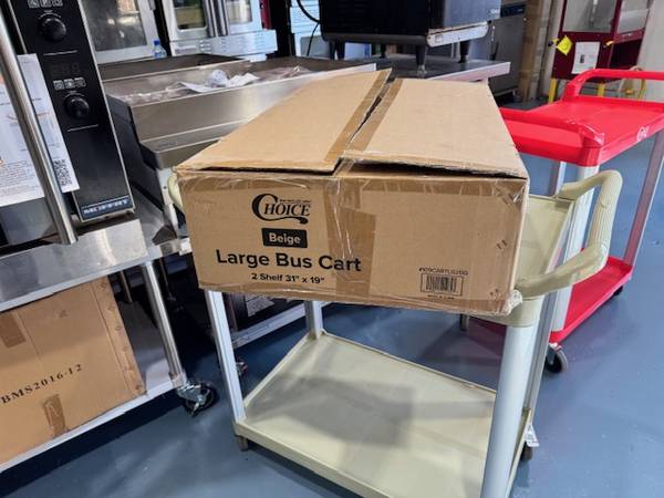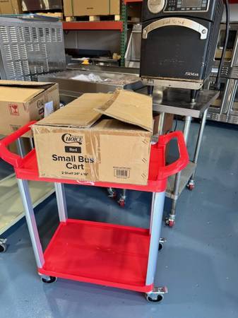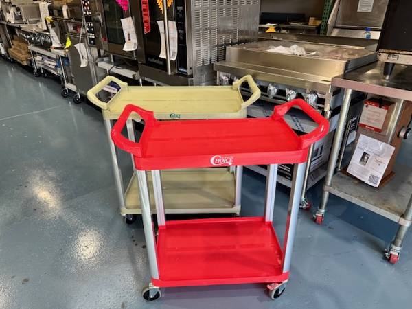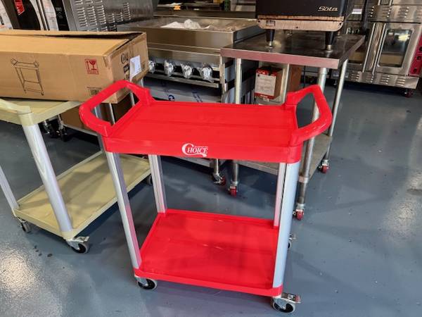 I have 6 red and 2 grey 32" by 16" 2 level bussing carts at $35 each, I also have 1 beigh and 3 grey 42" by 20" 2 level bussing carts for $50 each. . We are located at GENE SHOOK RESTAURANT EQUIPMENT at 12583 Crenshaw Blvd , in Hawthorne CA , 90250. Call us for all your restaurant equipment needs. We readily stock both new and used and always great prices! We specialize in refrigerators, freezers, fryers, griddles, stoves, prep tables, stainless steel tables, safes, char grills, keg orators, bar back, sinks, ice machines, and much more! CALL US AT 310_292_1182 Always call us for the best deal