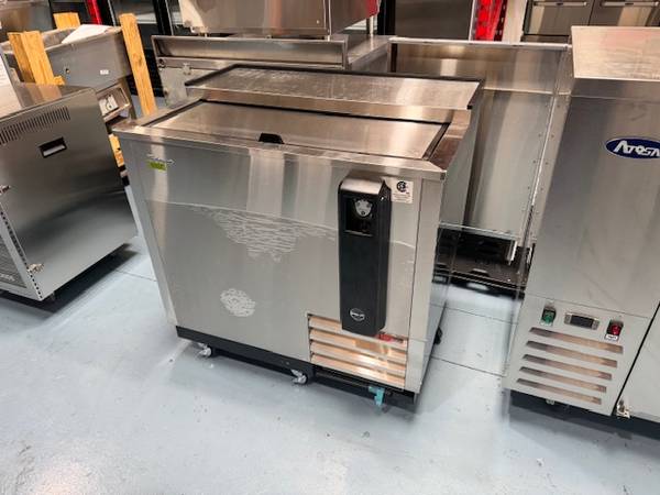 THIS IS A new Turbo Air TBC-36SD-N6 36" Super Deluxe Stainless Steel Bottle Cooler. THEY GO FOR OVER $2690 NEW AT $1250 IT IS A GREAT BUY. NOTE UNIT WAS IN STORAGE WARRANTY MAY NOT APPLY. We are located at GENE SHOOK RESTAURANT EQUIPMENT at 12583 Crenshaw Blvd , in Hawthorne CA , 90250. Call us for all your restaurant equipment needs. We readily stock both new and used and always great prices! We specialize in refrigerators, freezers, fryers, griddles, stoves, prep tables, stainless steel tables, safes, char grills, keg orators, bar back, sinks, ice machines, and much more! CALL US AT 310_292_1182 Always call us for the best deal