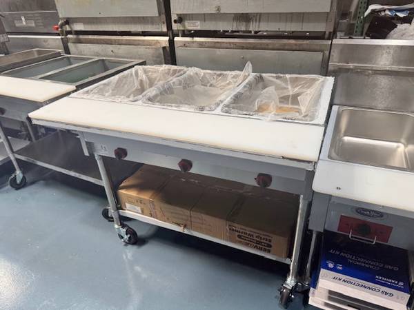 THIS IS NEW OMCAN 3 WELL STEAM TABLES WE HAVE BOTH NAT GAS AND PROPANE UNITS THEY ARE $690 EACH WATER PANS ARE EXTRA SET OF 3 ARE $87, CASTERS ARE EXTRA SET OF 4 ARE $90 EXTRA.. THEY GO FOR OVER $1,200 NEW AT $650 IT IS A GREAT BUY. We are located at GENE SHOOK RESTAURANT EQUIPMENT at 12583 Crenshaw Blvd , in Hawthorne CA , 90250. Call us for all your restaurant equipment needs. We readily stock both new and used and always great prices! We specialize in refrigerators, freezers, fryers, griddles, stoves, prep tables, stainless steel tables, safes, char grills, keg orators, bar back, sinks, ice machines, and much more! CALL US AT 310_292_1182 Always call us for the best deal