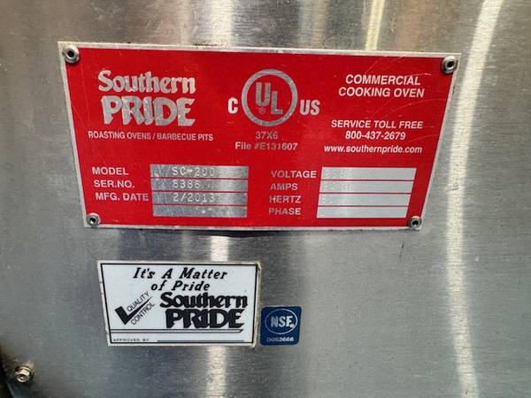 THIS IS A Southern Pride SC-200 Commercial Smoker Oven With Casters. THEY HOLD UP TO 240 POUNDS OF MEAT PER LOAD. THEY GO FOR OVER $12,300 NEW AT $3750 IT IS A GREAT BUY. WE HAVE 2 UNITS PRICE IS EACH. We are located at GENE SHOOK RESTAURANT EQUIPMENT at 12583 Crenshaw Blvd , in Hawthorne CA , 90250. Call us for all your restaurant equipment needs. We readily stock both new and used and always great prices! We specialize in refrigerators, freezers, fryers, griddles, stoves, prep tables, stainless steel tables, safes, char grills, keg orators, bar back, sinks, ice machines, and much more! CALL US AT 310_292_1182 Always call us for the best deal