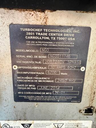 THIS IS A TurboChef SOTA NGO Rapid Cook Oven – Commercial Electric THEY GO FOR OVER $13,000 NEW AT $500 IT IS A GREAT BUY. unit has been tested and works fine. We are located at GENE SHOOK RESTAURANT EQUIPMENT at 12583 Crenshaw Blvd , in Hawthorne CA , 90250. Call us for all your restaurant equipment needs. We readily stock both new and used and always great prices! We specialize in refrigerators, freezers, fryers, griddles, stoves, prep tables, stainless steel tables, safes, char grills, keg orators, bar back, sinks, ice machines, and much more! CALL US AT 310_292_1182 Always call us for the best deal