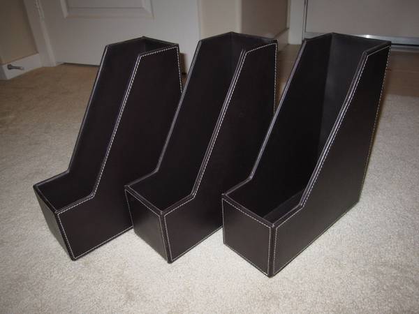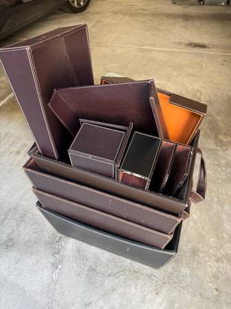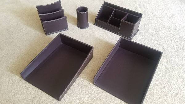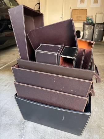 We have chocolate brown faux leather desk organizational pieces including baskets, magazine file holders, paper trays, letter organizers, all-in-one holder for paper, small items and pens, pen cups, and post-it/paper clip holders. These are in great condition. Prices range depending on what is purchase so message for details.