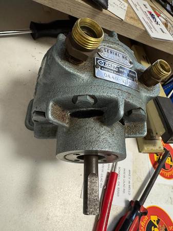 I purchased this pump that was with an electric motor mounted to a board years ago. I only wanted the motor so here's the pump, barely used for sale. One of the hose barbs is broken. The threads going into the unit appear to be 1/4' pipe thread.