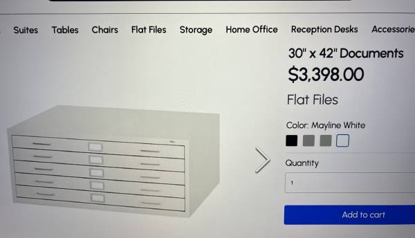 MAYLINE FLAT FILE CABINETS FOR 30in. X 42in. SHEETS, OUTSIDE MEASUREMENTS 46.75 X 35.5 X 15.5. 5 DRAWER WITH DUST COVERS. NEW STILL ON PALET READY FOR PICK UP OR DELIVERY. THESE CABINETS LIST FOR $3398.00. FORKLIFT ON SITE FOR LOADING. FREE DELIVERY IN LOS ANGELES AREA IF YOU BUY THREE OR MORE...