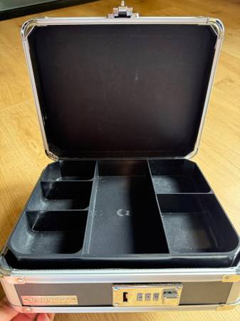 Vaultz cash box measuring 10” wide, 8” deep, and approximately 4.5” with handle. Box locks with 3 digit code you can set.