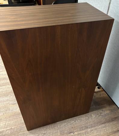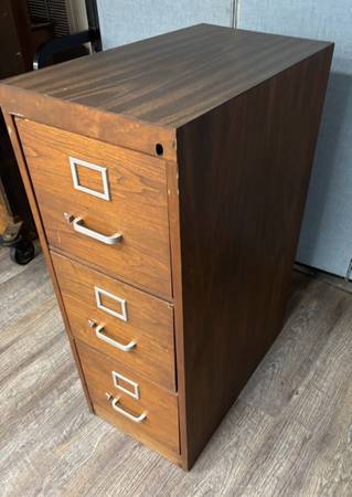 Selling a heavy solid vintage 3 drawer standard sized metal file cabinet with woodgrain finish. No lock or key. 41” TALL 15 3/4” WIDE 28” LONG ———$50———