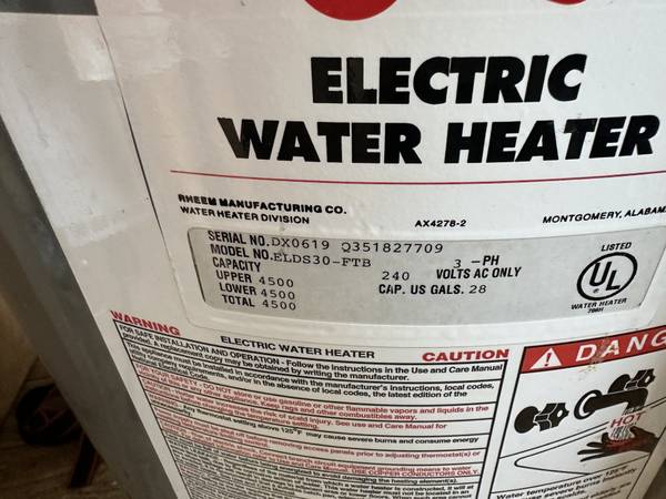 Electric Water Heater, Operating Voltage 208V AC, Phase Single, Three, Equivalent BtuH 40,946 BtuH, First Hour Rating 43 gal, Maximum Recovery Flow Rate 30 gph @ 40 Degrees F, Overall Height 30 in, Power Consumption 12,000 W, Tank Capacity 28 gal, Tank Diameter 23 in, Market Commercial, Number of Elements 2, Automatic Thermostat Yes, Cold Inlet Size 3/4 in, Cold Inlet Type NPT, Element Material Copper, Magnesium Oxide, Energy Factor 0.92